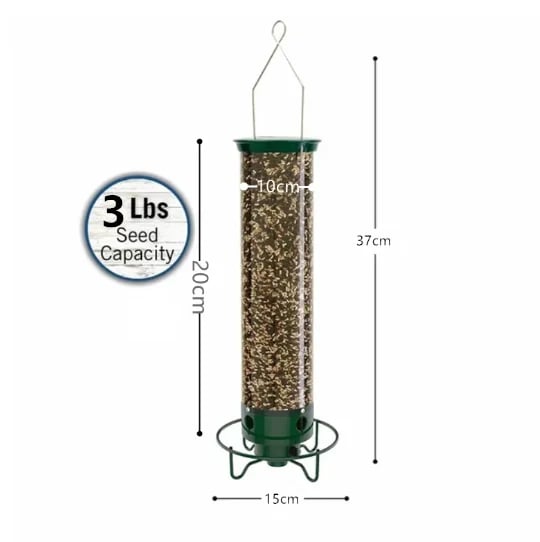Tube bird feeder holds up to birdseed and has four feeding ports