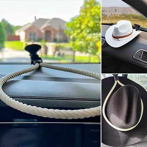 Custom-made hat mounts that work in various cars and trucks. These mounts are made with genuine lariat rope and hold their shape very well because of the stiffness of the rope. They mount to the windshield or dash with a suction cup.