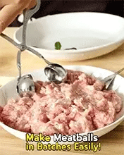 Our meat baller is easy to put chopped meat on the scoop, then clip it, the redundant meat will squeeze out from the hole on it, easily complete the meatball production.
